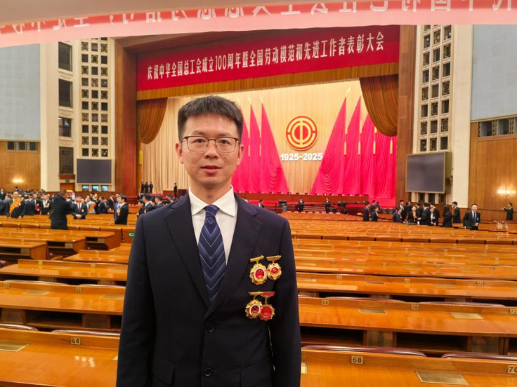 本网讯 4月28日上午,庆祝中华全国总工会成立100周年暨全国劳动模范和先进工作者表彰大会在北京举行。ac米兰比赛现场直播2011级给排水专业校友、合肥水务集团“雷锋精神”听漏队队长张杨被授予“全国劳动模范”称号,在人民大会堂现场参会。